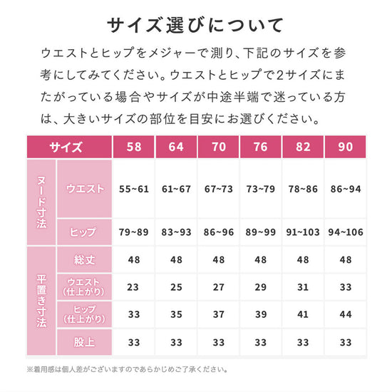 サイズ | 【58】(ウエスト55-61cm ヒップ78-89cm) 【64】(ウエスト61-67cm ヒップ83-93cm) 【70】(ウエスト67-73cm ヒップ86-96cm) 【76】(ウエスト73-79cm ヒップ89-99cm) 【82】(ウエスト78-86cm ヒップ91-103cm) 【90】(ウエスト86-94cm ヒップ94-106cm) 股上寸法:約34cm(全サイズ共通) 股下寸法:19cm(全サイズ共通) |
