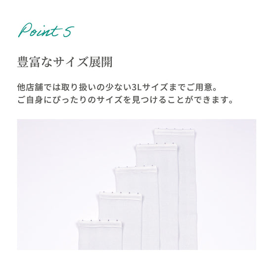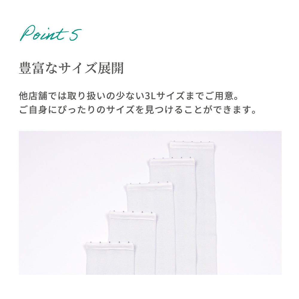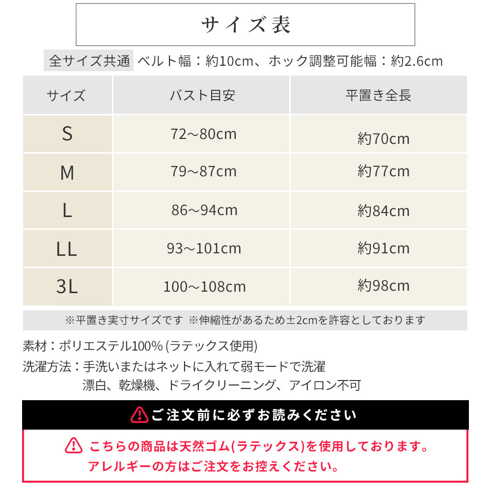 | サイズ | Sサイズ(バスト72-80cm) Mサイズ(バスト79-87cm) Lサイズ(バスト86-94cm) LLサイズ(バスト93-101cm) 3Lサイズ(バスト100-108cm) [平置きサイズ(cm)] Sサイズ:全長約70・幅10 Mサイズ:全長約77・幅10 Lサイズ:全長約84・幅10 LLサイズ:全長約91・幅10 3Lサイズ:全長約98・幅10 |