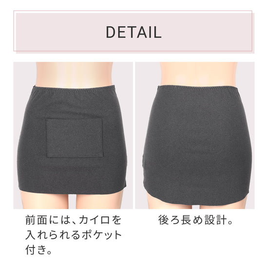 - カイロポケット付き – 前面にポケットがあり、カイロを入れて腹部を温められます。